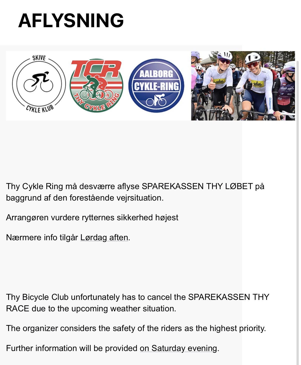 Varsler om vindstød op til 32 m/s gjorde det umuligt at gennemføre løbet forsvarligt.